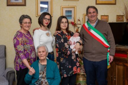L’ultima arrivata, Soleil Alessandra Bruno, è nata una settimana fa. Una dolcezza ed una tenerezza infinita vedere Soleil in braccio alla trisavola nonna Gilda Merenda di 93 anni. Soleil è oggi la più coccolata di una famiglia speciale. Una famiglia alla quinta generazione.