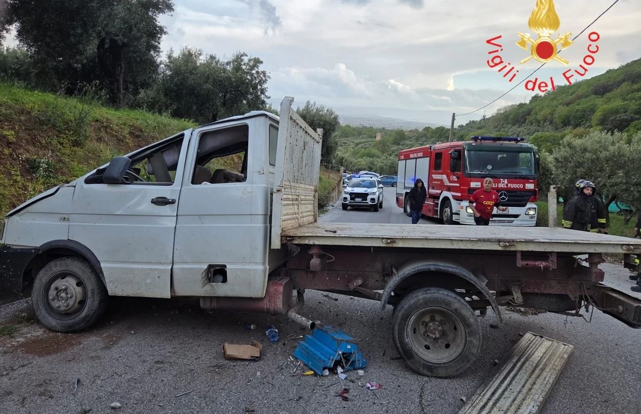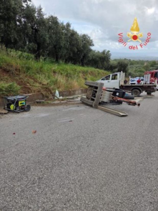 “Incidente stradale ieri pomeriggio a Lamezia Terme. Un furgone Iveco Daily che trasportava sul cassone un miniescavatore, a causa di un probabile surriscaldamento dei freni, mentre percorreva una discesa molto ripida avrebbe perso il controllo, terminando la sua corsa contro il muretto di delimitazione della carreggiata, ribaltandosi.”