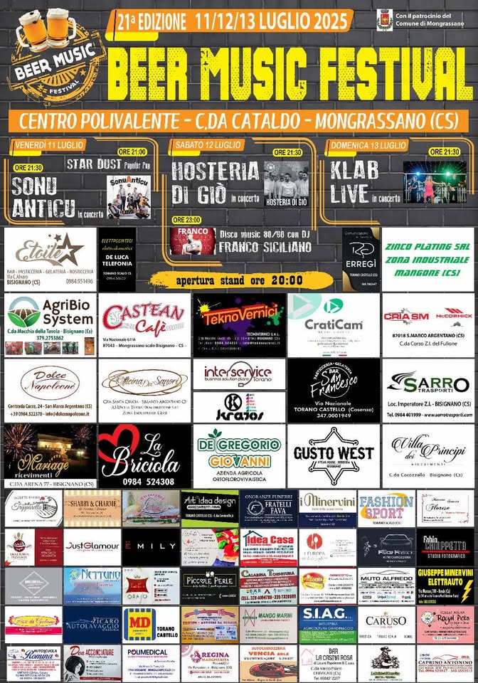 Tutto pronto per la 21° edizione del “Beer Music Festival”, che da oggi, e per i prossimi 3 giorni, dall’11 al 13 luglio, animerà la piazza del Centro Polivalente di C.da Cataldo di Mongrassano. 3 serate di concerti e spettacoli, tanta gastronomia e, come sempre, fiumi d birra…