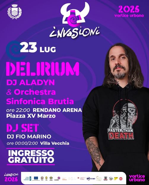 Protagonisti della serata saranno DJ Aladyn – icona del turntablism italiano e voce di punta di Radio Deejay – e l’Orchestra Sinfonica Brutia. Un mix inedito di armonie classiche ed elettroniche: lo scratch si fonde con gli archi e i fiati, dando vita a un vortice sonoro e visivo che conquisterà il pubblico di Cosenza.