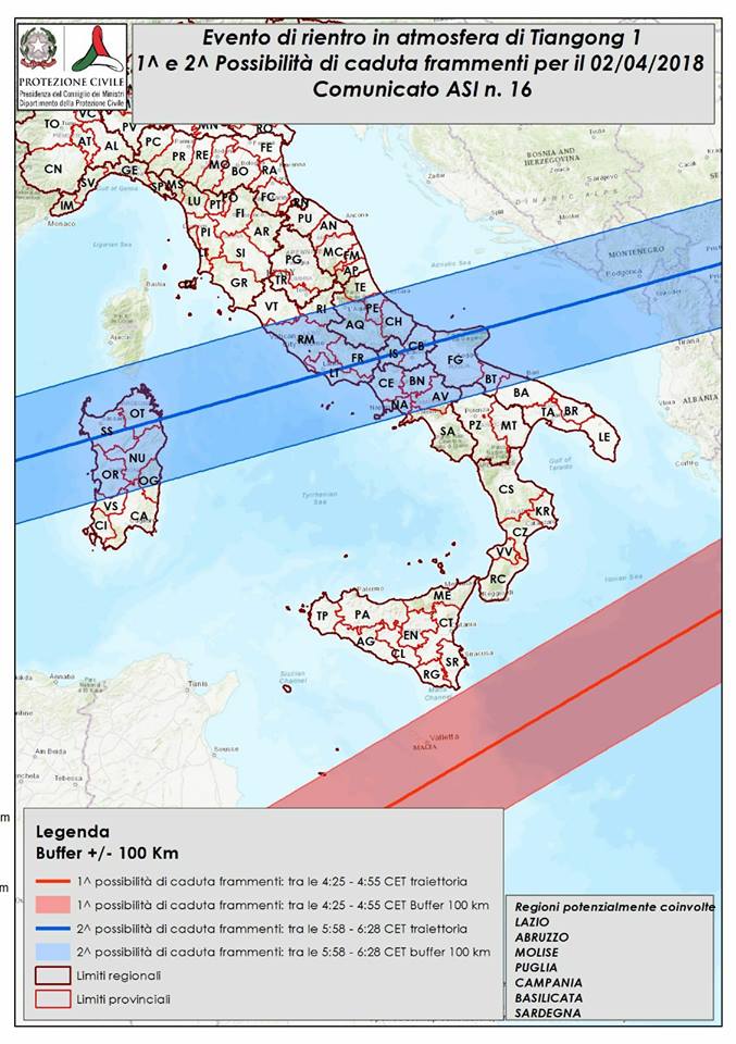 Quanto alle finestre temporali di rischio per l’Italia, cioè di possibile interessamento del nostro territorio dalla caduta di eventuali detriti, sono state ridotte da quattro a due: come si vede dalla figura allegata, la prima con rientro tra le 04,25 e 04,55 ora italiana ma che non riguarda praticamente il territorio italiano, se non una piccola parte dell’isola di Lampedusa; la seconda tra le 05,58 e le 06,28, che riguarderà le regioni del centro Italia. La probabilità di detriti sull’Italia è dello 0,1%.
