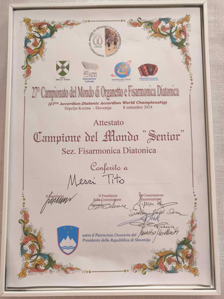Si è appena concluso il 27° Campionato Mondiale di “Organetto e Fisarmonica Diatonica” svoltosi a Hrpelje-Kozina in Slovenia lo scorso fine settimana (6-8 settembre 2024), organizzato dall’Amisad e patrocinata dalla Presidenza della Repubblica Slovena.