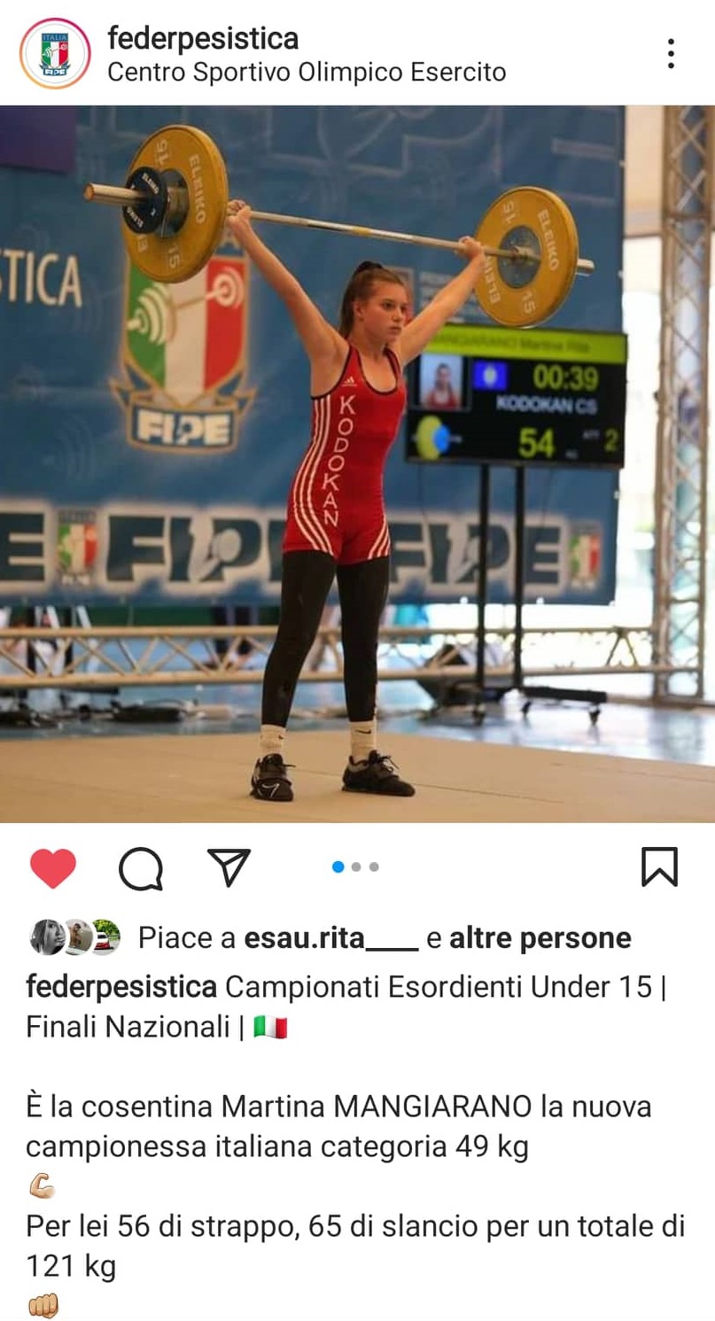 La cosentina, classe 2008 della società sportiva Kodokan, si conferma campionessa Italiana. Lo scorso novembre a Verona aveva vinto il titolo Italiano negli esordienti 13, battendo il record di categoria nello slancio e nel totale.