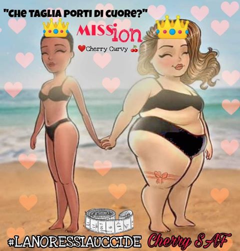 Cherry SAF ha voluto regalare un posto anche a questa taglia, mettendola accanto alle Curvy di taglie superiori, fino alla taglia 50, per dare un messaggio chiaro alle ragazze e donne cadute in anoressia, facendole ‘avvicinare’ da una taglia che non possano vedere come lontanissima dalla loro idea di dare una nuova possibilità di rinascita al proprio corpo“