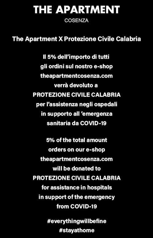 Inoltre l’azienda ha deciso di destinare il 5% dell’importo degli ordini del suo e-shop www.theapartmentcosenza.com alla Protezione Civile Calabria per l’assistenza negli ospedali in supporto all’emergenza sanitaria da COVID-19.