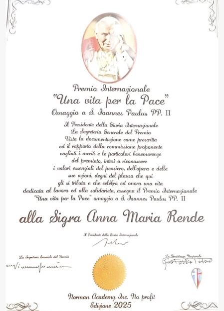 Anna Maria Rende, Presidente dell’ALT – Associazione Lotta Tumori ODV-ETS di Cosenza, è stata insignita del prestigioso Premio Internazionale “Una Vita per la Pace”, tributo dedicato a San Giovanni Paolo II, durante la cerimonia tenutasi sabato 5 luglio 2025 presso il Salone delle Feste dell’Aeronautica di Roma