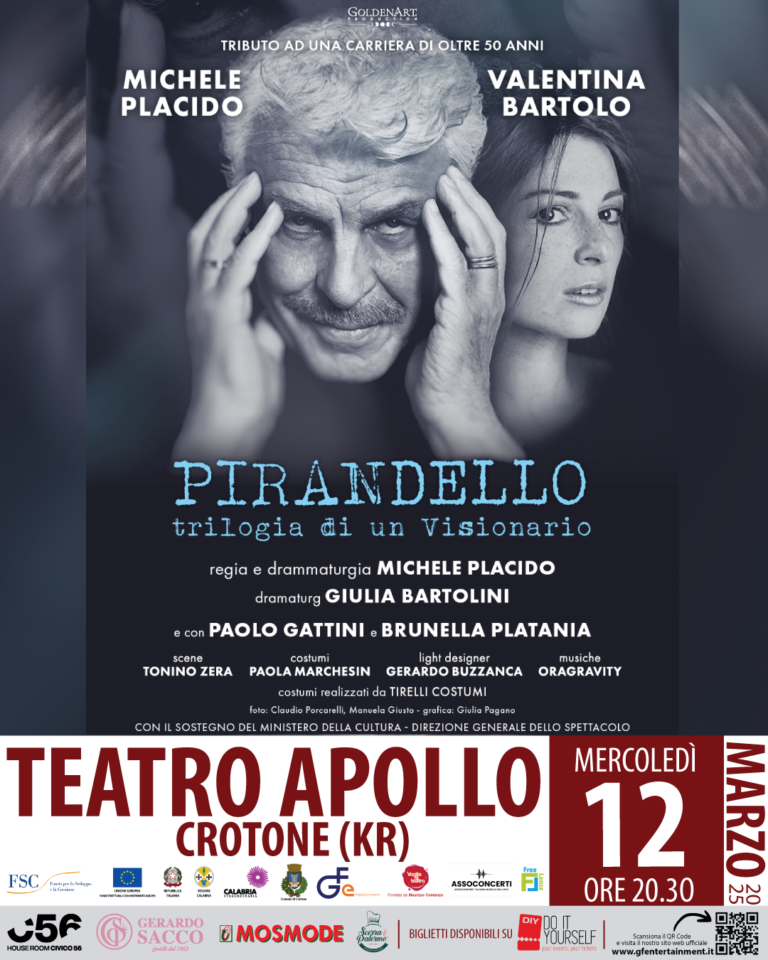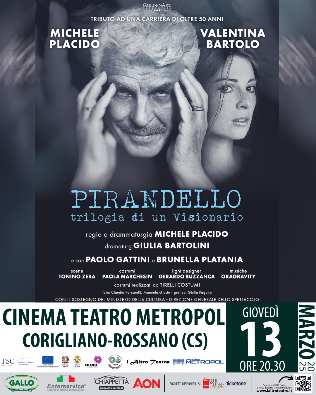 Placido, con la sua regia e interpretazione, offrirà una prospettiva unica su Pirandello, celebrando la maestria di un autore che ha saputo sondare le profondità dell’animo umano. Mercoledì 12 marzo, ore 20.30, “Pirandello. Trilogia di un visionario” sarà rappresentato al Teatro Apollo di Crotone, nell’ambito della rassegna “Crotone…Voglia di Teatro”, mentre giovedì 13 marzo, ore 20.30, sarà in scenaal Cinema Teatro Metropol di Corigliano Rossano (Rassegna L’Altro Teatro – On stage Metropol). Rassegne, curate da Gianluigi Fabiano, e co-finanziate con “risorse PSC Piano di Sviluppo e Coesione 6.02.02 erogate ad esito dell’Avviso “Programmi di Distribuzione Teatrale” della Regione Calabria – Dipartimento Istruzione Formazione e Pari Opportunità – Settore Cultura”.