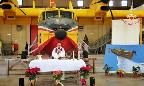 “All’aeroporto di Lamezia Terme, all’interno degli hangar che ospitano la flotta canadair dei vigili del fuoco, è stata celebrata una messa in suffragio dell’equipaggio che ha perso la vita durante le operazioni di spegnimento incendio boschivo in provincia di Catania