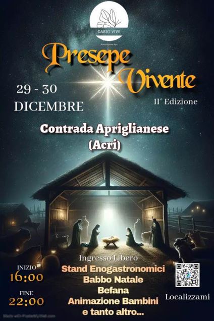 Lo straordinario evento si terrà il 29 e 30 Dicembre, dalle ore 16 in poi, nel cuore della pittoresca contrada Apriglianese, nel comune di Acri, splendido scenario naturale ai piedi della Sila dove prenderà vita la 2ª Edizione del Presepe Vivente, ogni dettaglio sarà pensato per ricreare l’atmosfera del Natale di una volta.
