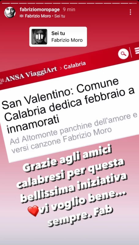 Ad Altomonte i versi dell’ultimo successo a Sanremo di Fabrizio Moro, il cantante ringrazia nelle sue storie su Instagram