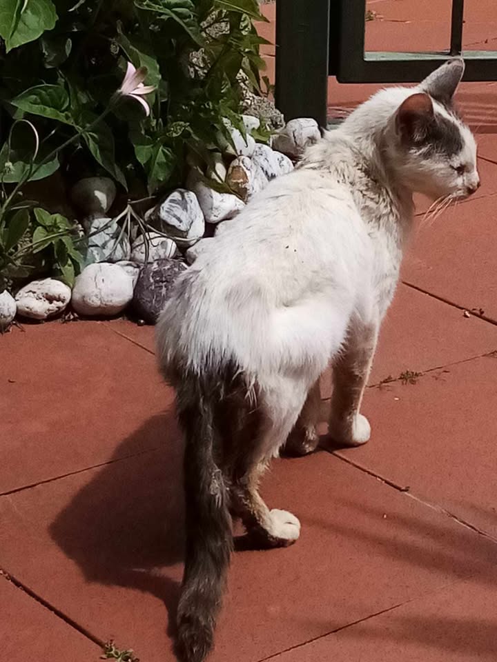 I due gattini piccoli grigi, sono stati uno avvelenato, e l’altro schiacciato e portato agonizzante davanti casa della signora,,, e sarebbe morto poco dopo. La gatta malconcia e con le zampine bruciate è quella che appare, prima, splendida nella foto insieme ad altri due gatti.