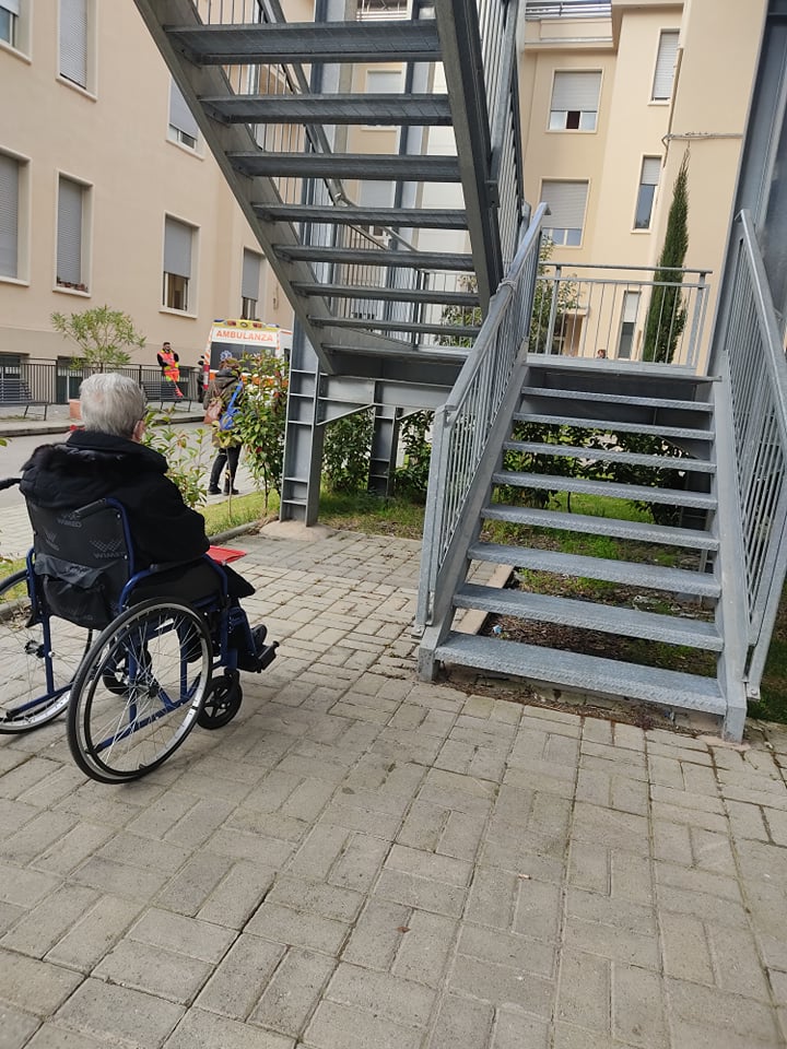 Come potete ben vedere, mia nonna 87 anni invalida con la carrozzina, prenotata in chirurgia dell’ospedale annunziata di Cosenza, secondo il genio che ha messo un ambulatorio chirurgico al primo piano, doveva salire questa rampa di scala antincendio con tutta la carrozzina.