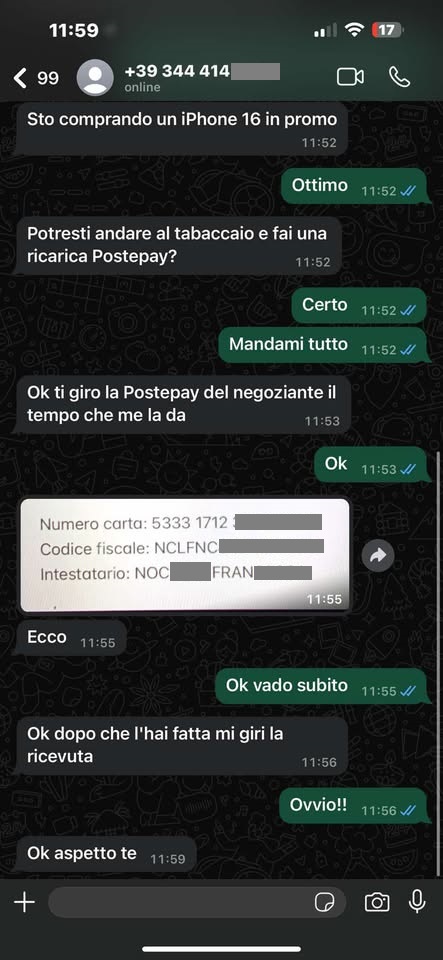 Qui nella conversazione mi viene chiesto da “mio figlio” di fare una ricarica postepay urgente ai dati che mi stava inviando, al fine di acquistare un nuovo telefono perchè lui aveva perso/bloccato tutto.