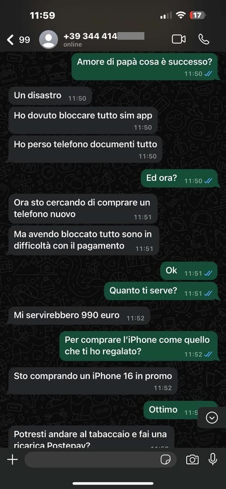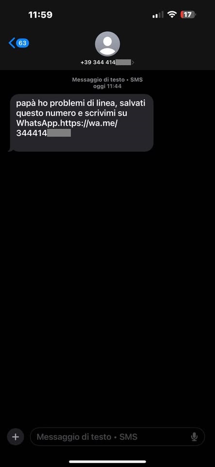 In pratica ho ricevuto un messaggio via sms, da un numero che non ho in rubrica, che si spacciava per mio figlio e mi chiedeva di contattarlo sullo stesso numero, ma via Whatsapp.
