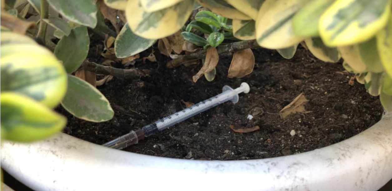 Per l’ennesima volta m’imbatto nella stessa scena, le aiuole diventano pattumiera per siringhe.