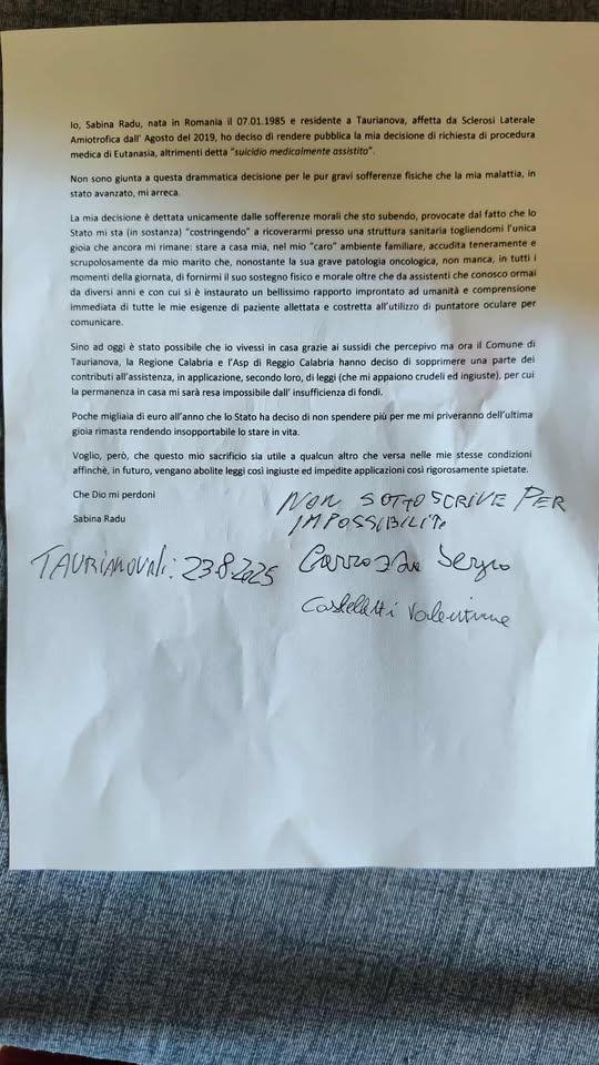 “Io, Sabina Radu, nata in Romania il 17/01/1985 e residente a Taurianova, affetta da sclerosi laterale amiotrofica dall’agosto del 2019, ho deciso di rendere pubblica la mia decisione di richiesta di procedura medica di Eutanasia, altrimenti detta “suicidio medicalmente assistito”.