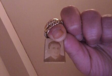 Questa è la foto della medaglia che era alla catenina del battesimo di mio fratello Franco e che portava mio padre. In più quella che portava al collo intrecciata e con bracciale uguali …che recuperai dopo incidente di mio fratello…