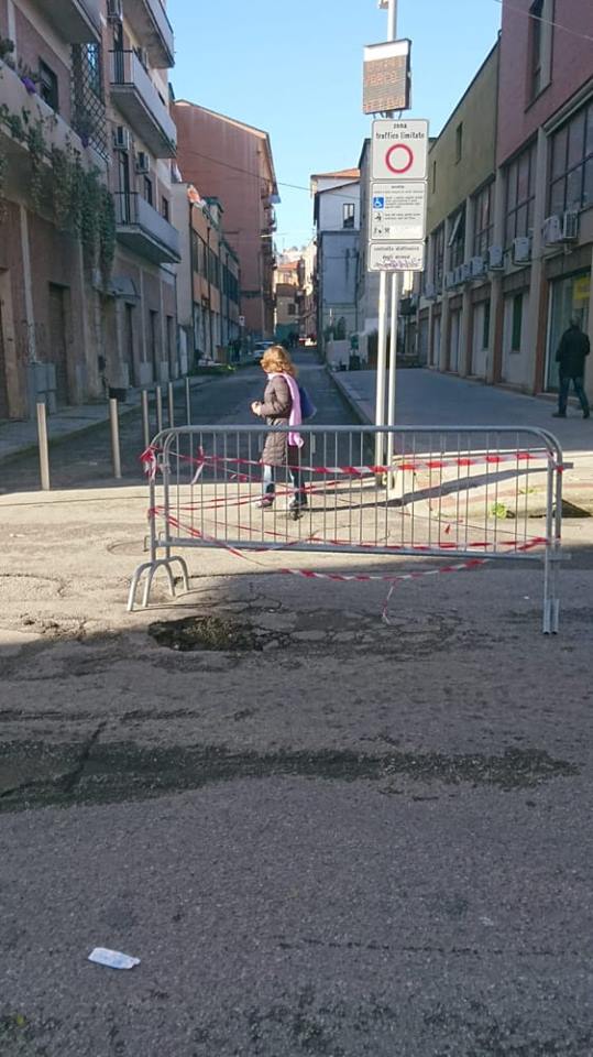 Via 24 maggio: Prima voragine aperta nel manto stradale in corrispondenza dell’ufficio dell’agenzia delle entrate diversi giorni fa e mai riparata, solo segnalata con una transenna.