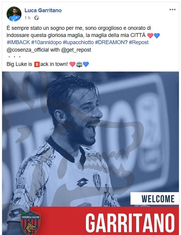 “La Società Cosenza Calcio comunica di aver acquisito, a titolo temporaneo fino al 30 giugno 2019, il diritto alle prestazione sportive del calciatore Luca Garritano, proveniente dall’A.C. Chievo Verona. L’attaccante ha firmato un accordo annuale fino al 30 giugno 2019.”