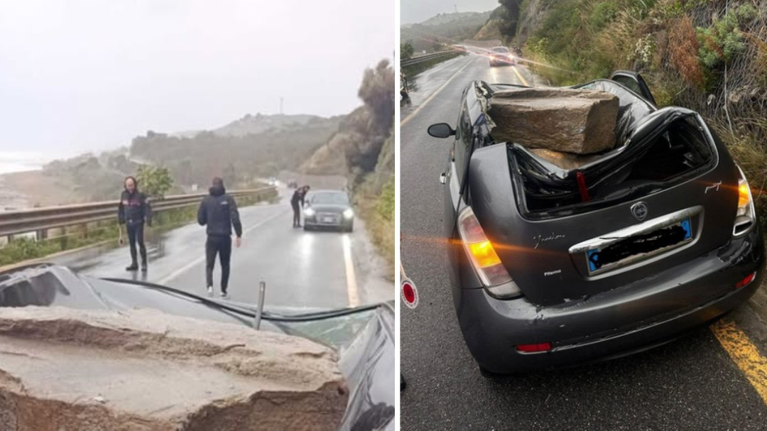 “A causa del maltempo, due grossi massi si sono staccati dal costone e hanno centrato il tetto di una Lancia Y, schiacciandolo. A bordo c’era solo il conducente che è rimasto solo leggermente contuso.”