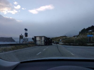 “Un camion si è ribaltato a causa del forte vento nei pressi della Statale 18, al bivio tra Praia a Mare Sud e San Nicola Arcella Nord.