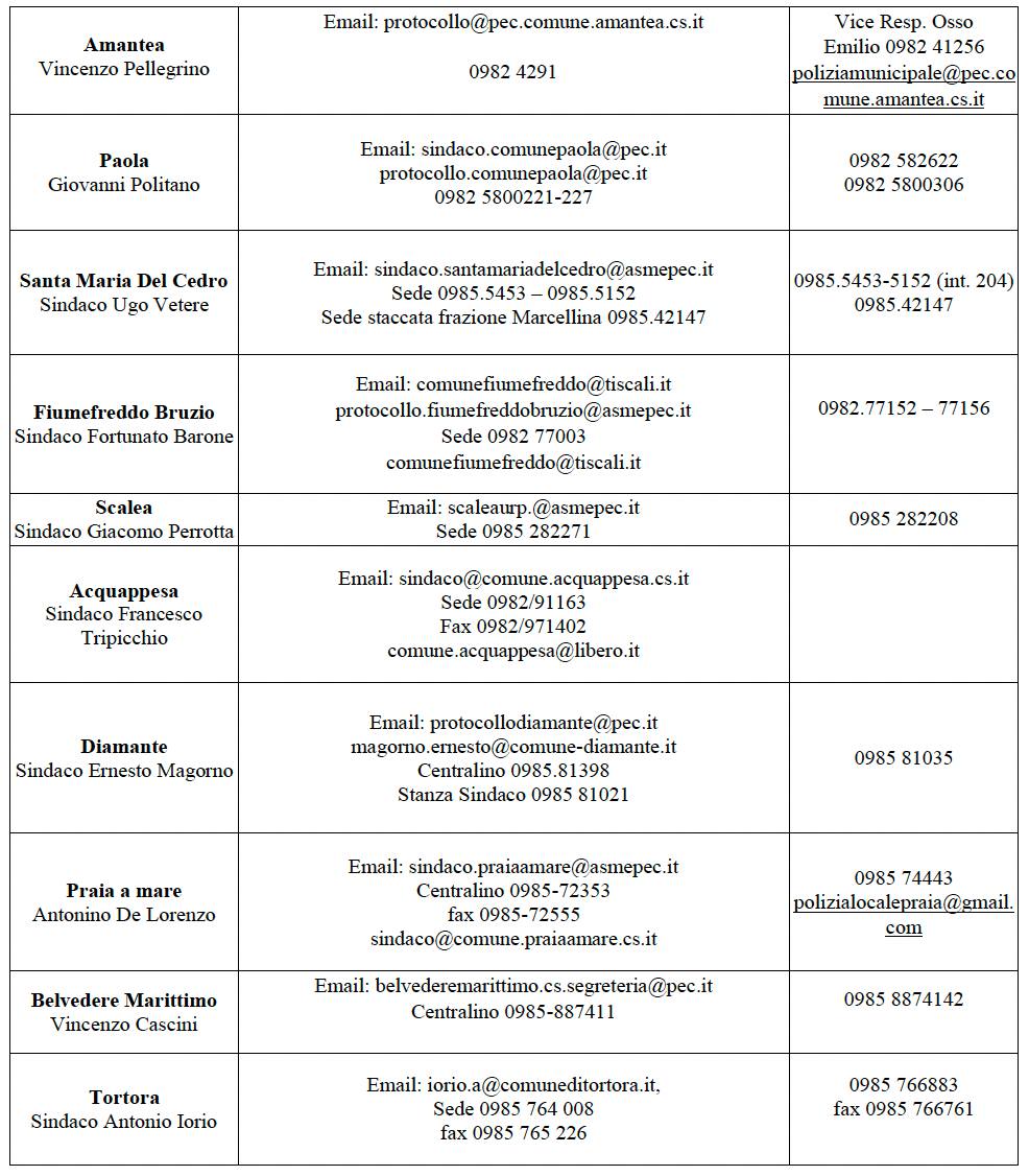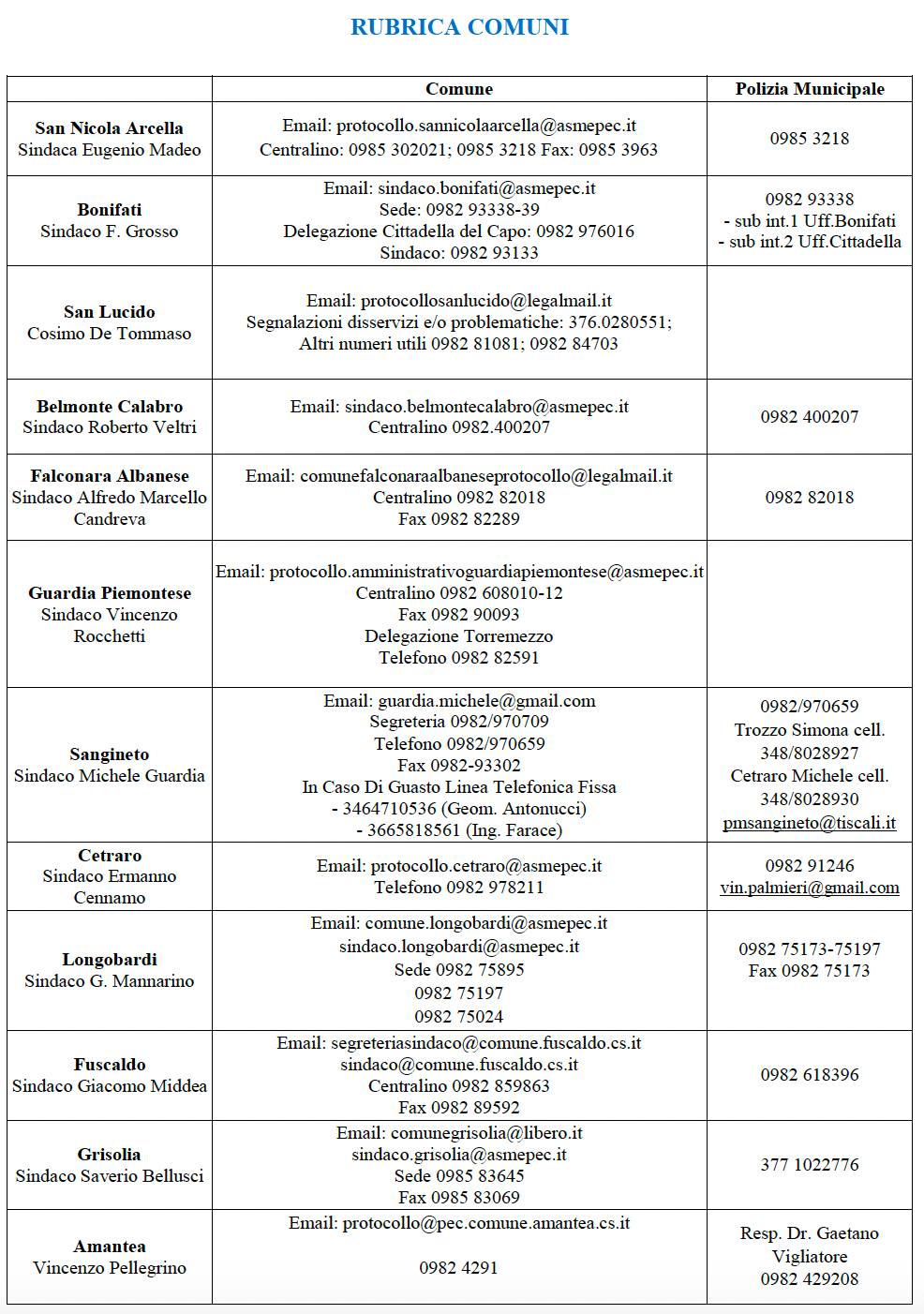 Qui la rubrica creata per voi con i numeri utili per ogni comune: