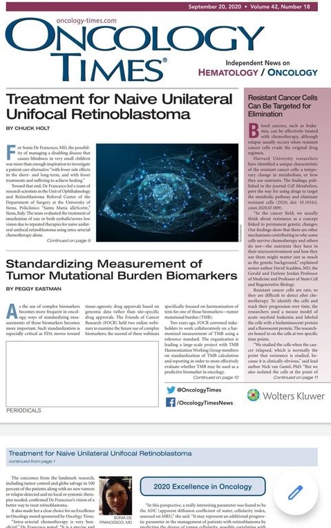 La rivista internazionale “Oncology Times” ha conferito la “Honorable Mention” alla nostra Sonia De Francesco, medico oculista di San Lucido, ricercatrice a “Le Scotte” di Siena, nell’“Award international exellence in oncology” 2020, per i suoi studi che permettono di curare e salvare i bambini dal retinoblastoma.