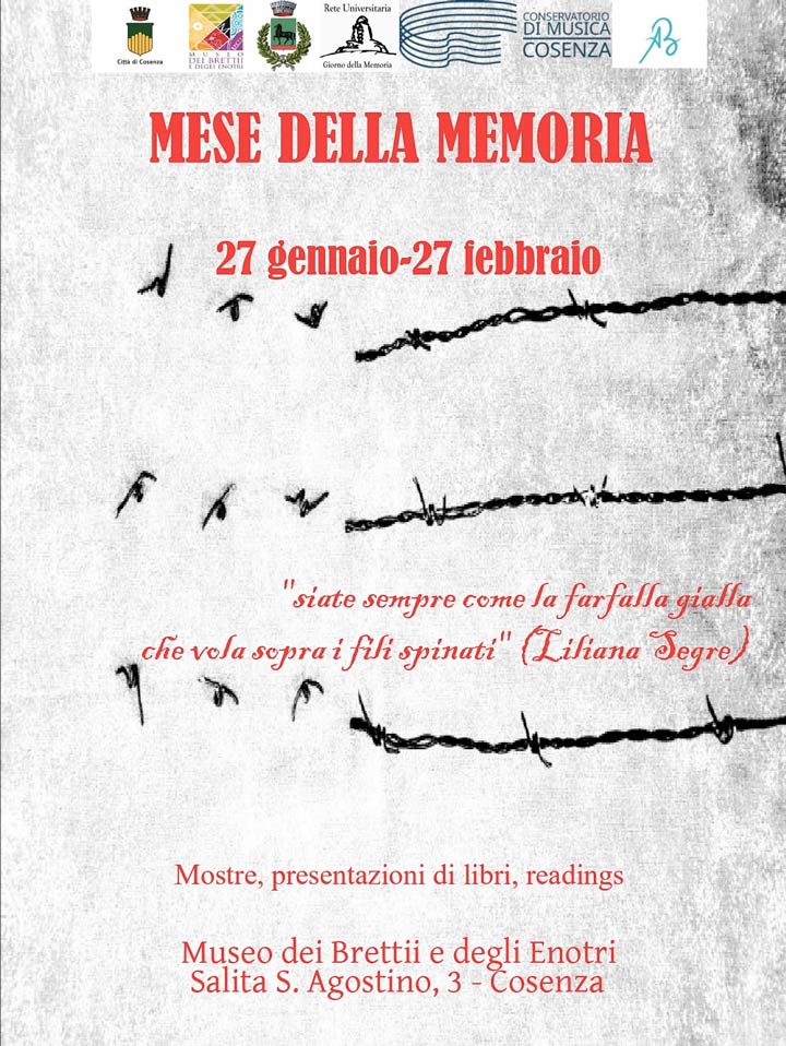 “L’Amministrazione comunale, guidata dal Sindaco Franz Caruso, in collaborazione con il Museo dei Brettii e degli Enotri e la Rete Universitaria per il Giorno della Memoria, ricorderà quest’anno la Shoah lo sterminio sistematico degli Ebrei d’Europa, organizzato dal regime nazista nel corso della seconda guerra mondiale, non solo con il Giorno della Memoria, in programma giovedì 27 gennaio, ma con un mese di iniziative che andranno avanti fino al 27 febbraio.