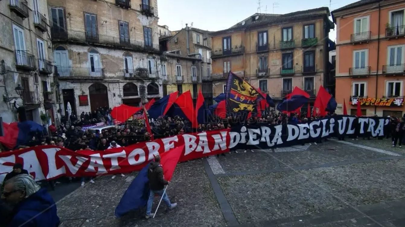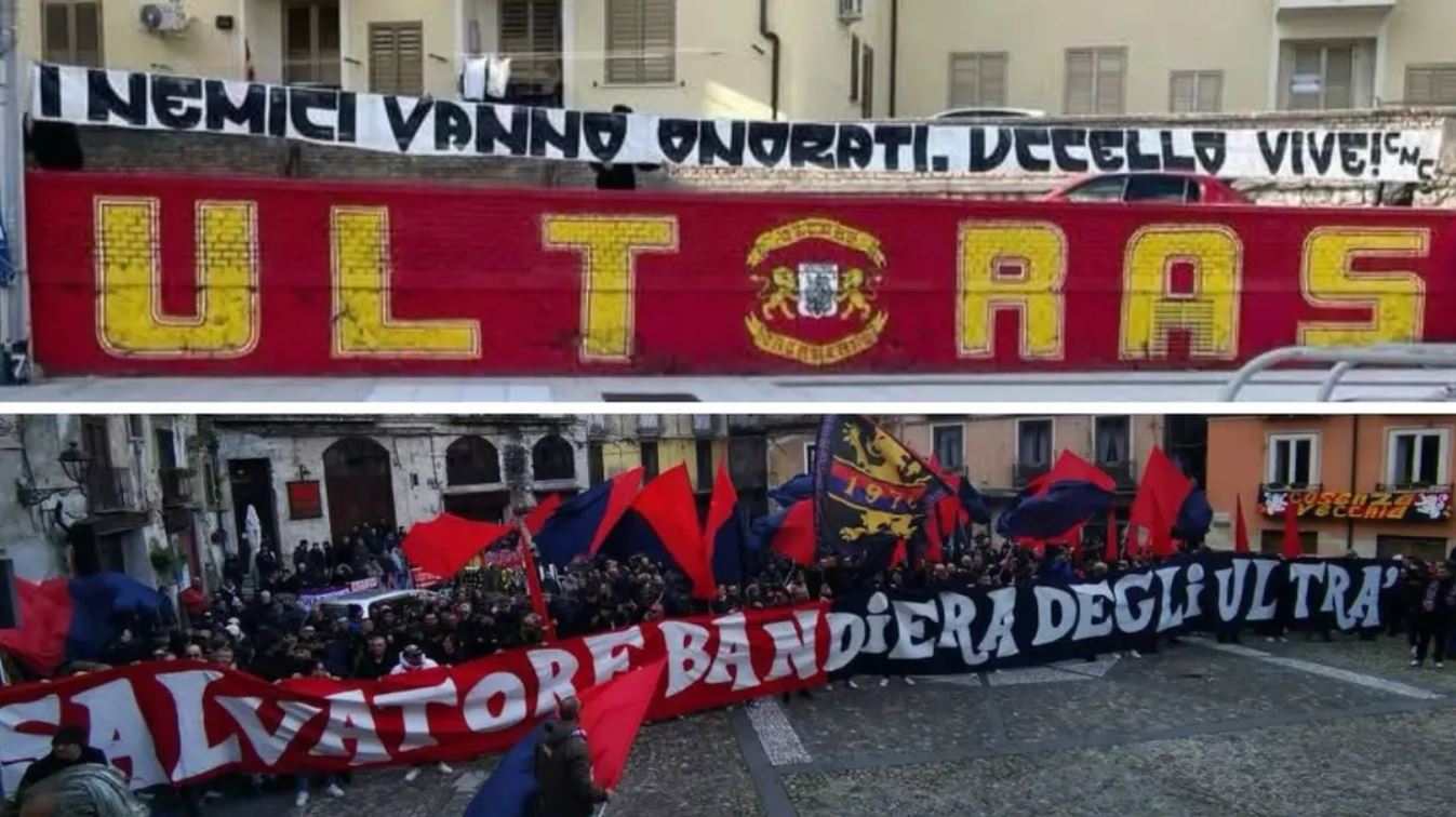 Lo striscione dei rivali di sempre dopo il bonifico per sostenere le spese dei funerali dello storico tifoso rossoblù. Vicinanza ed emozioni tra il capoluogo di Regione e il Duomo di Cosenza