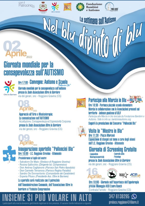 Sabato 9 Aprile, con la partecipazione di diverse associazioni del territorio, si terranno l’apertura dello sportello Palloncini Blu presso l’Istituto Scolastico, la Mostra a cura di tutti gli ordini di scuola afferenti all’istituto Comprensivo, con la partecipazione dell’associazione Kairos, e la Marcia in Blu, promossa sul territorio nazionale dalla Fondazione Autismo e Bambini Onlus.