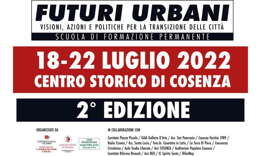 Per una settimana, sociologi, politologi, filosofi, urbanisti, economisti, giuristi terranno lezioni dedicate all’analisi degli aspetti sociali, economici e ambientali della politica e dell’ecologia urbana partendo dalle sfide esistenti, ma anche puntando all’identificazione di nuove possibilità di cooperazione e alla costruzione di nuove reti e conoscenze. In questa prospettiva, il corso propone un approccio multi-metodologico: alle lezioni della mattina, di taglio più teorico, seguiranno dibattiti e laboratori pomeridiani che vogliono favorire la presa di parola delle/dei partecipanti e una loro maggiore interazione con le realtà associative che operano stabilmente nella città di Cosenza.