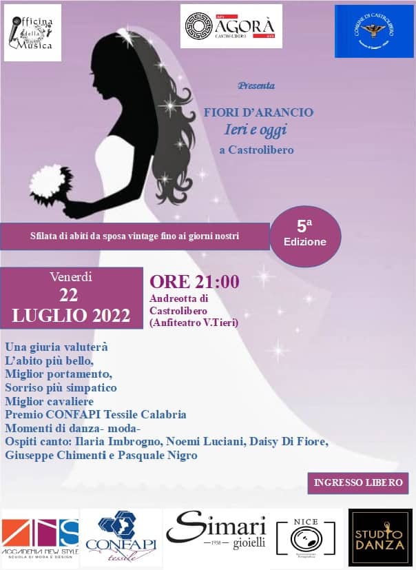 La quinta edizione di “Fiori d’arancio ieri e oggi a Castrolibero” riapre i battenti dopo due anni di fermo causa Covid, e vedrà come protagonisti gli abiti da sposa vintage fino ai giorni nostri, indossati da ragazze, mamme e mogli, accompagnate da gentili cavalieri.