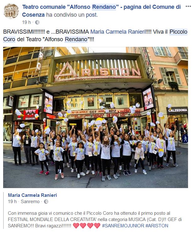“Con immensa gioia vi comunico che il Piccolo Coro ha ottenuto il primo posto al FESTIVAL MONDIALE DELLA CREATIVITA’ nella categoria MUSICA (Cat. D)!! GEF di SANREMO!! Bravi ragazzi!!!!!!