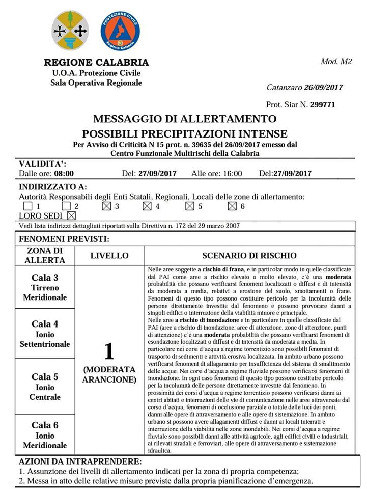 DALLE ORE 08:00 DEL 27-09-2017 ALLE ORE 16:00 DEL 27-09-2017 E’ PREVISTO UN LIVELLO DI ALLERTA ARANCIONE (LIVELLO 1) “