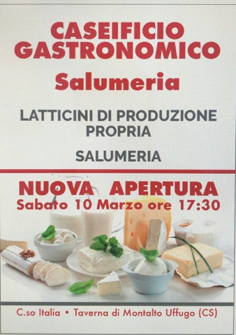 Domani pomeriggio, 10 marzo alle ore 17:30, inaugura il “Caseificio Gastronomico Salumeria” in Corso Italia 108 a Taverna di Montalto Uffugo: