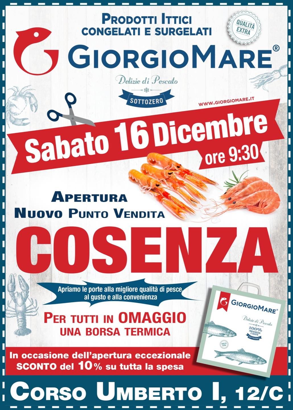 Inaugura sabato 16 dicembre, a Cosenza in Via Umbero I°, 12, il secondo punto vendita (dopo quello di Rende inaugurato 12 mesi fa), del noto franchising “GiorgioMare”, azienda leader in Italia nel settore ittico surgelato.