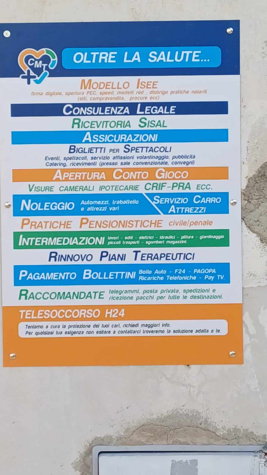 Il centro è molto attento alle esigenze di salute delle persone, e grazie a delle convenzioni effettuate con studi medici, infermieri ed operatori sanitari professionisti del settore, con le dovute competenze, offre presso il domicilio dei pazienti servizi infermieristici e assistenza domiciliare, prelievi a domicilio, visite mediche specialistiche a domicilio e non, servizio ambulanze e taxi sanitario, fisioterapie domiciliari, servizio tac e risonanza magnetica con strutture convenzionate con s.s.n., radiografie, doppler, holter cardiaco e pressorio, ecografie domiciliari, rinnovi piani terapeutici, prenotazioni cup, servizio farmaci a domicilio con farmacia convenzionata (questo servizio e’ completamente gratuito), servizio farmaci e ausili dalla farmacia territoriale, esenzione ticket e pagamento ticket.