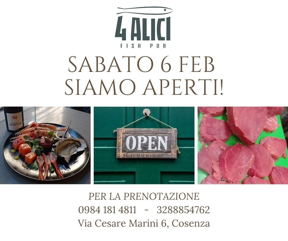 Domani inaugura a Cosenza il nuovo locale “4 Alici Fish pub”, in via Cesare Marini 6b. Il “4 Alici” si presenta per la prima volta ai cittadini, ma ha in realtà alle spalle una lunga esperienza e storia nella città dei bruzi.