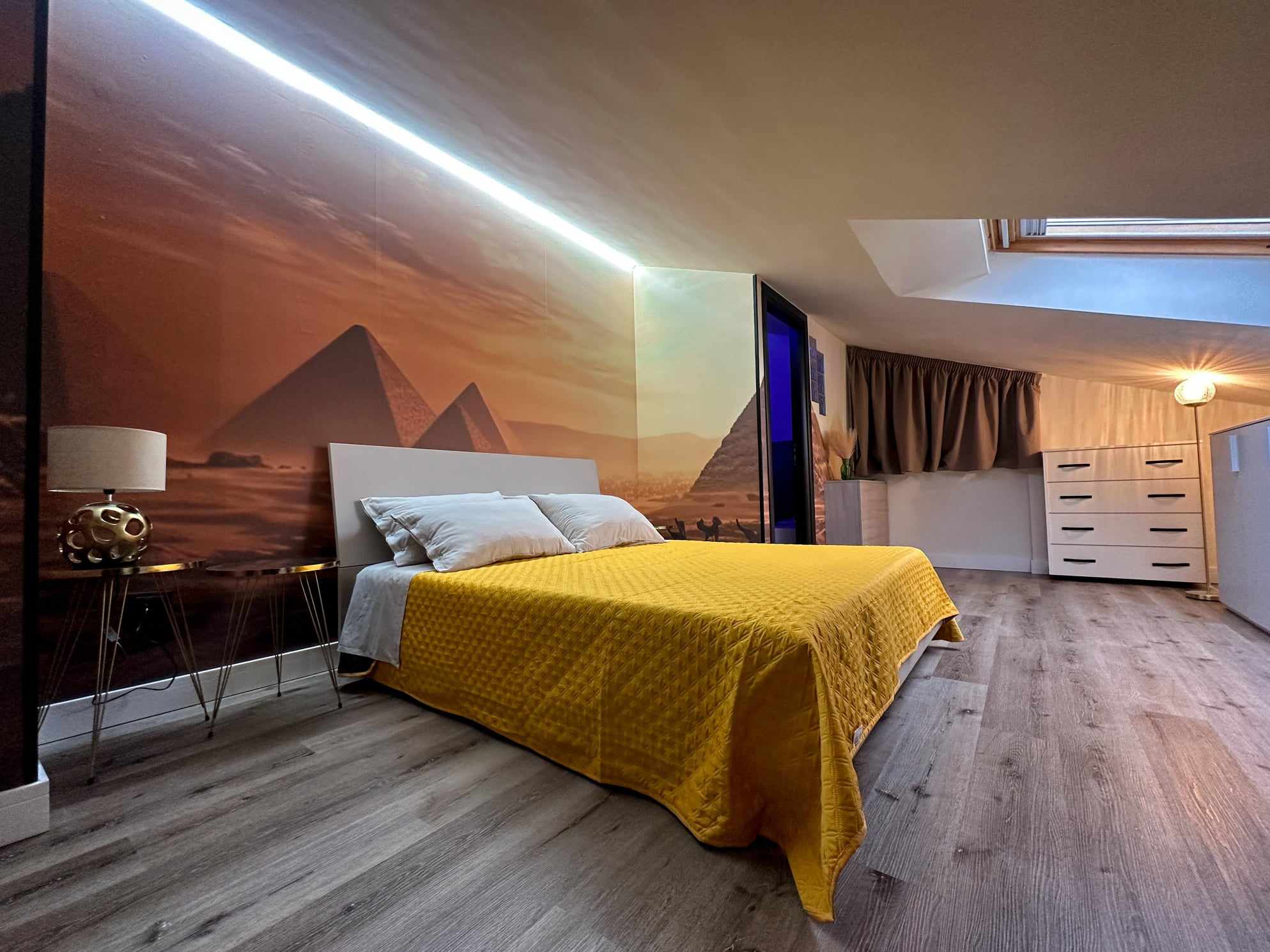 Troveremo di seguito le camere “Sfinge room” e “Piramid Room”. Entrando nella prima, possiamo notare l’attenzione ai dettagli con cui è stata arredata, dotata di un comodo letto in memory foam, che vi assicurerà un sonno profondo e rigenerante, con la sfinge, appunto) che fa da sfondo. La camera dispone di smart TV, armadio per riporre gli effetti personali e di un delizioso angolo lettura. Il bagno della Sfinge room è un’oasi di lusso e relax, progettato per coccolarvi con ogni comfort, dotato di un ampia e rigenerante vasca idromassaggio per 2 persone.
