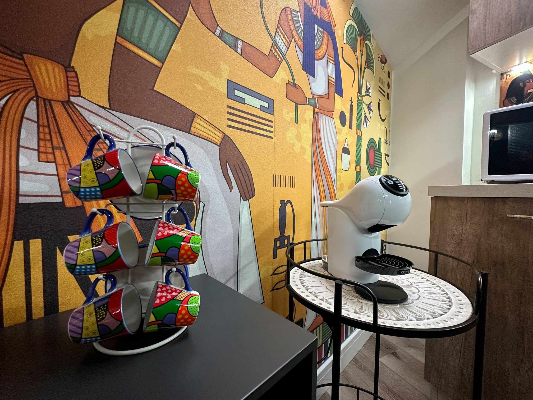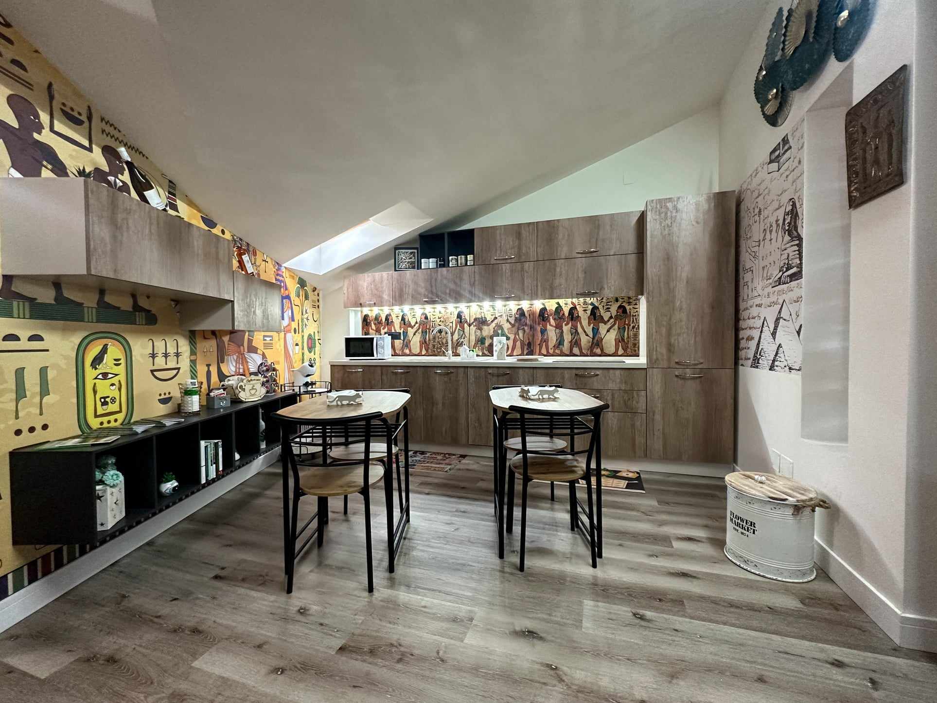 “All’ingresso sarete accolti da un spazio comune luminoso ed accogliente, arredato in stile ‘Egitto’, unico e particolare nel suo genere, attrezzato con un comodo divano dove ci si può rilassare gustando una buona tisana, a disposizione degli ospiti, guardando la TV davanti al camino che fa da sfondo a questo piccolo angolo relax, e una cucina dotata di tutti i comfort (frigorifero, freezer,lavastoviglie, microonde, bollitore, macchina da caffè, cucina ad induzione, attrezzata di tutto) dove si possono preparare pietanze in assoluta autonomia, con tavoli per poter pranzare o cenare in assoluta comodità.