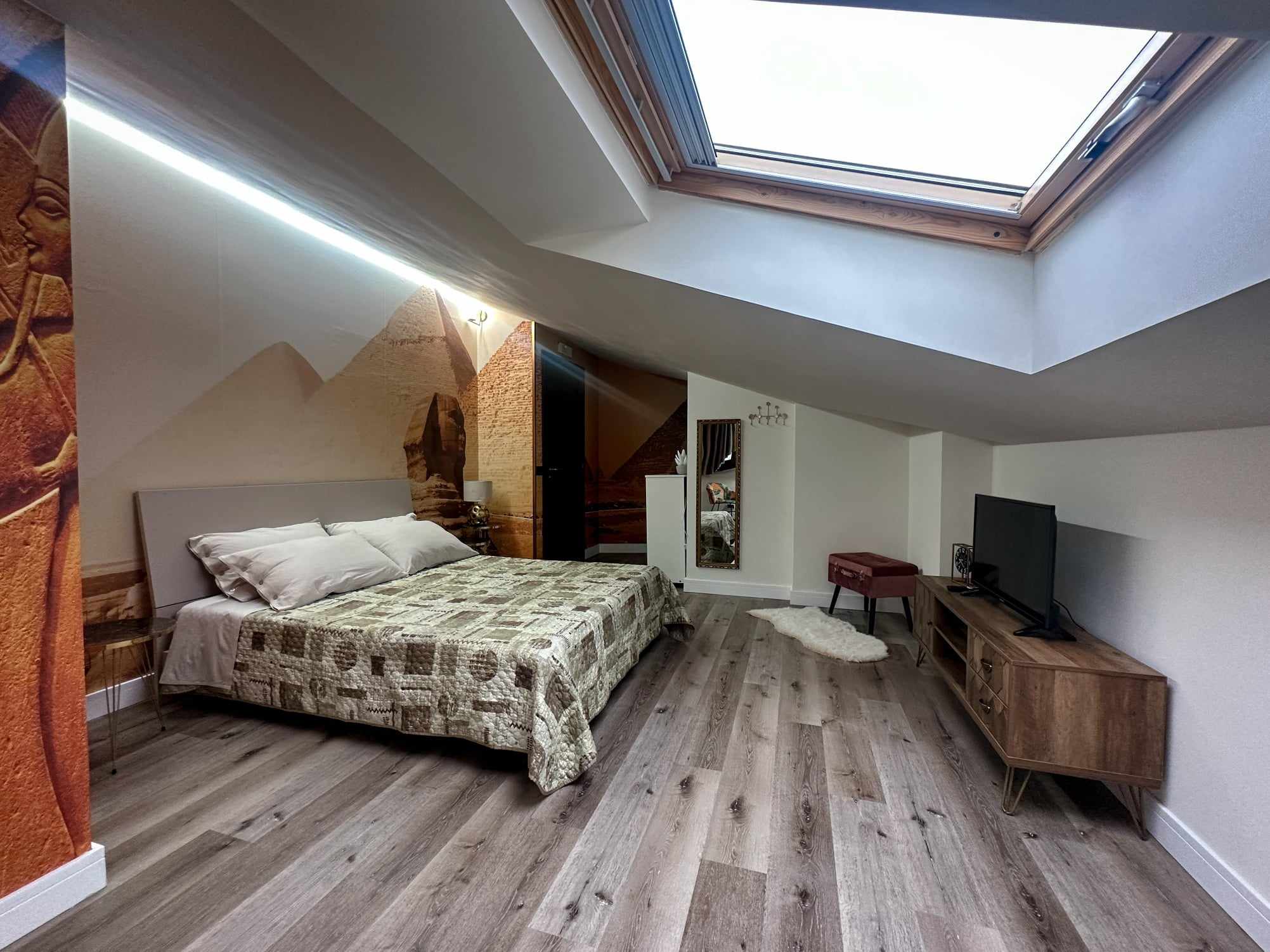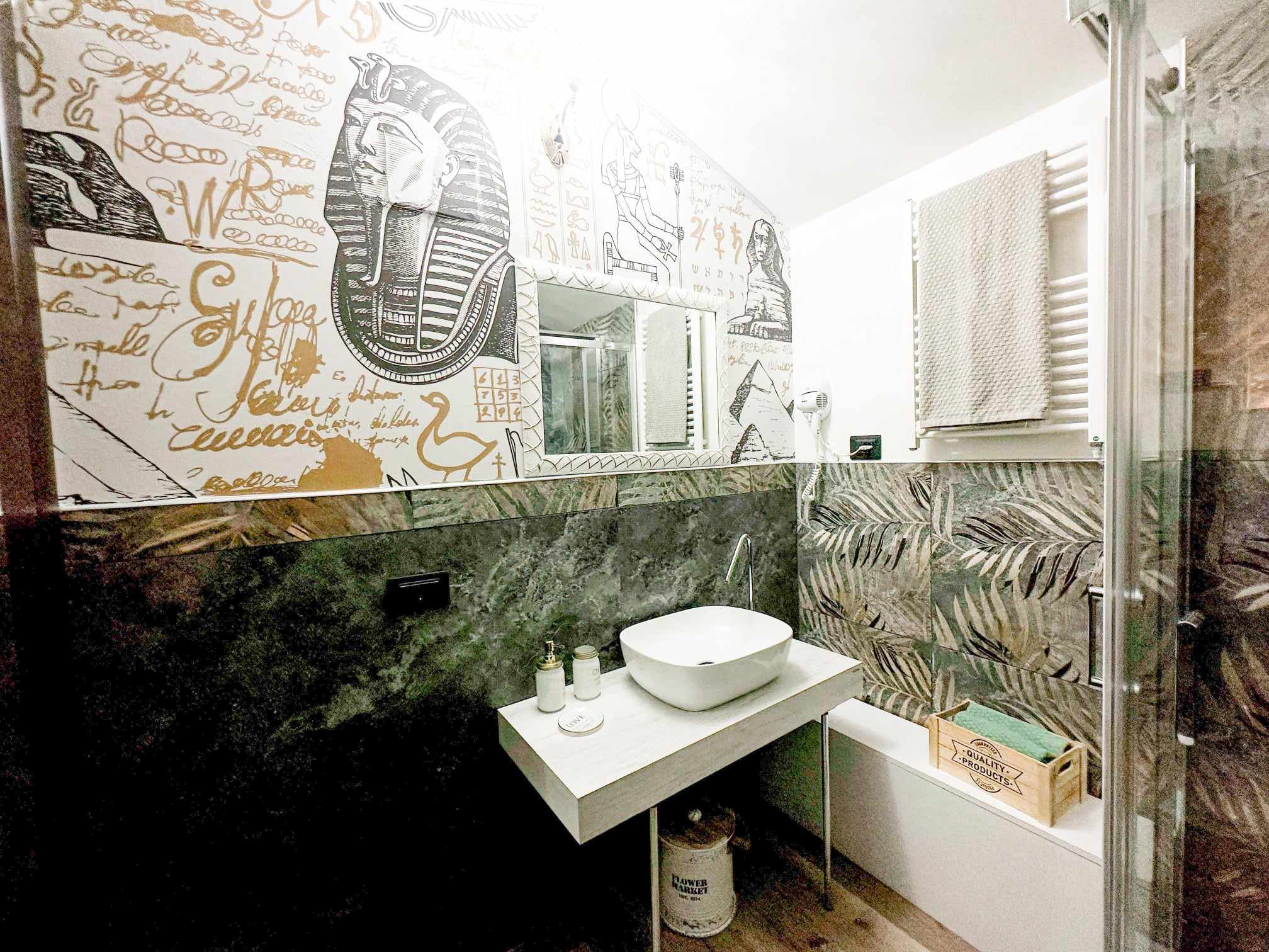 Troveremo di seguito le camere “Sfinge room” e “Piramid Room”. Entrando nella prima, possiamo notare l’attenzione ai dettagli con cui è stata arredata, dotata di un comodo letto in memory foam, che vi assicurerà un sonno profondo e rigenerante, con la sfinge, appunto) che fa da sfondo. La camera dispone di smart TV, armadio per riporre gli effetti personali e di un delizioso angolo lettura. Il bagno della Sfinge room è un’oasi di lusso e relax, progettato per coccolarvi con ogni comfort, dotato di un ampia e rigenerante vasca idromassaggio per 2 persone.