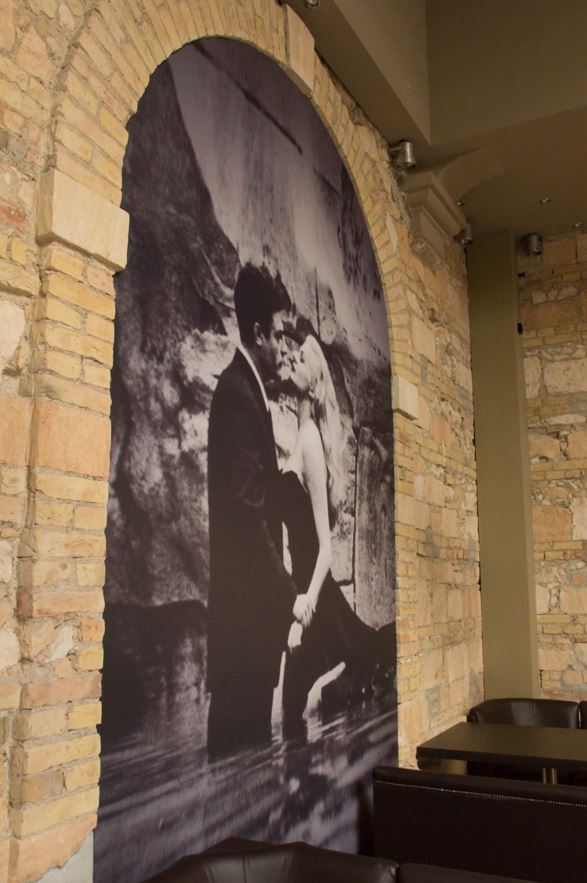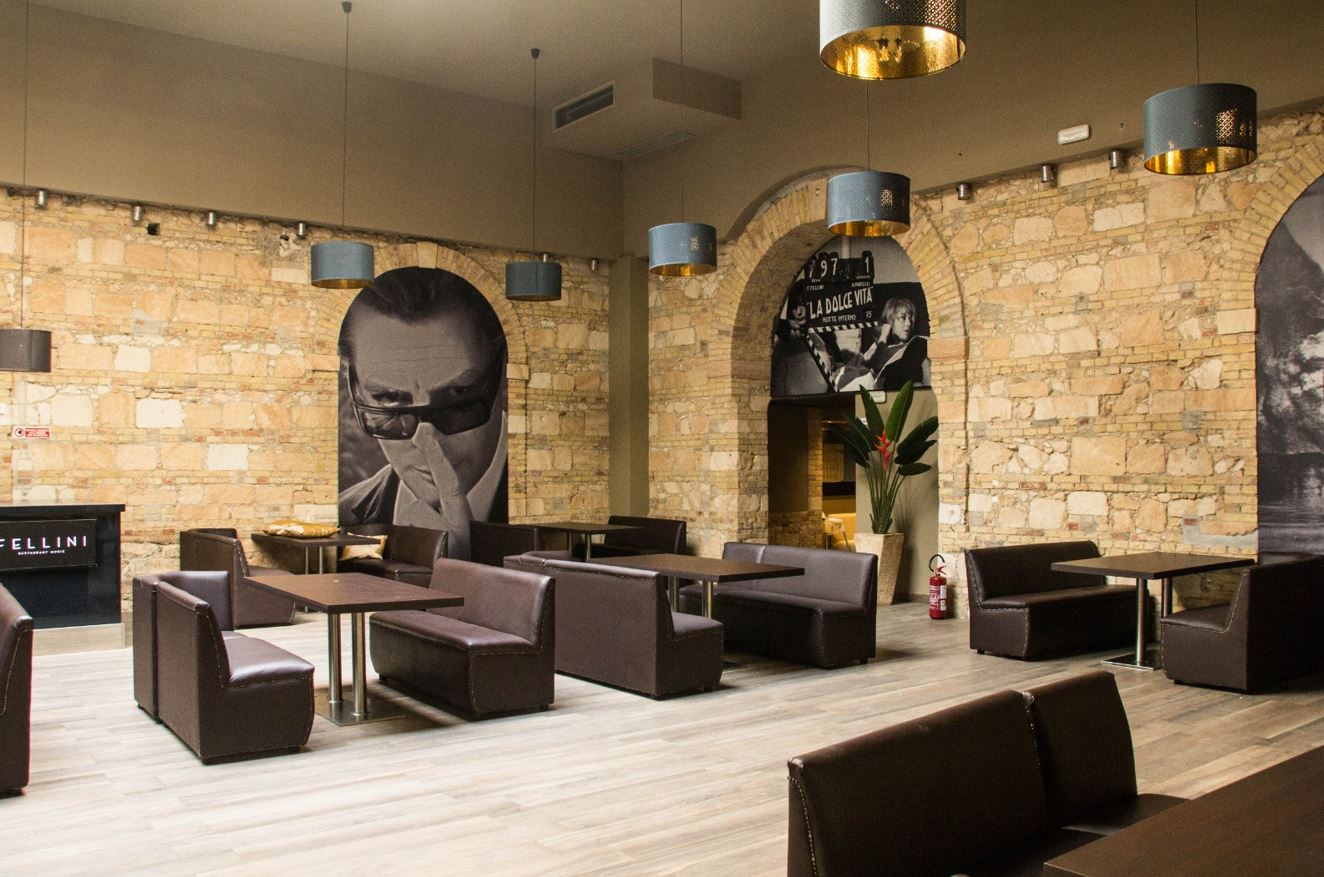 Il Fellini è un luogo magico, arredato da splendide stampe in bianco e nero, che riportano alla vita e alle creazioni del genio romagnolo, vincitore di cinque premi Oscar. Tra le gigantografie che impreziosiscono l’ambiente, c’è anche la scena più iconica del cinema italiano del XX secolo: Anita Ekberg nella Fontana di Trevi, con l’acqua che le arriva quasi ai fianchi, chiama Marcello Mastroianni: “Marcello, come here. Hurry up!”. Cinque parole inglesi che sanno di arte e gusto italiani.