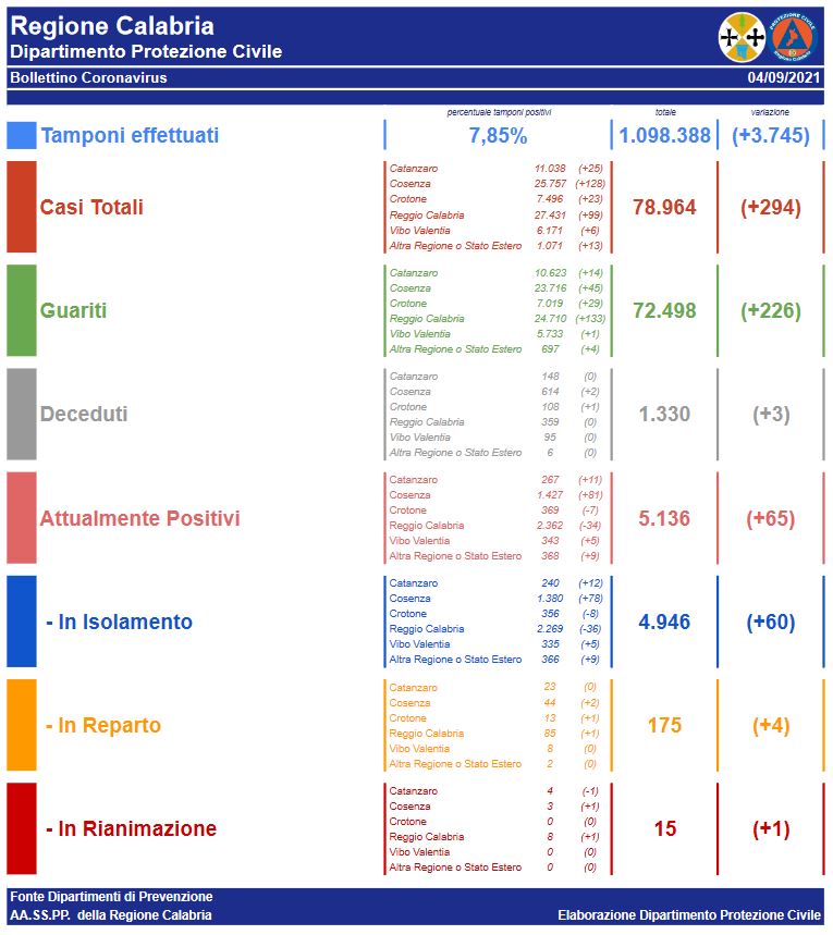 294 nuovi positivi al Covid (128 a Cosenza) nelle ultime 24 ore in Calabria, su un totale di 3.745 tamponi effettuati.