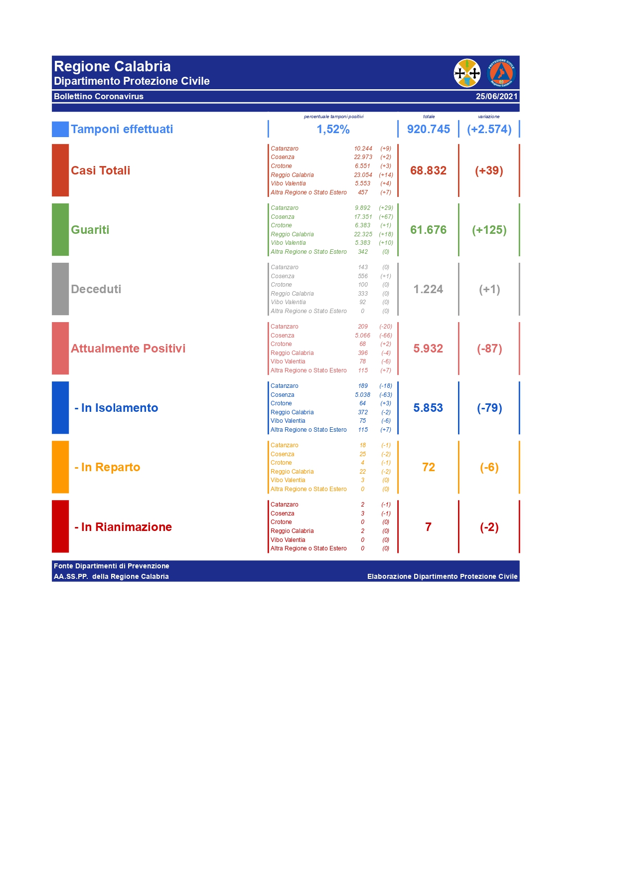 – Crotone: CASI ATTIVI 68 (4 in reparto, 0 in terapia intensiva, 64 in isolamento domiciliare); CASI CHIUSI 6483 (6383 guariti, 100 deceduti).
