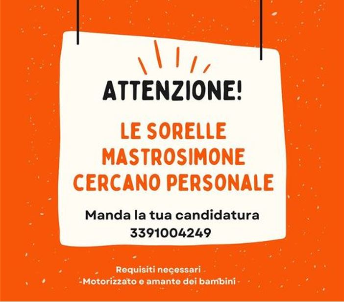 “Le sorelle Mastrosimone, associazione Marameo con sede a Montalto, cerca giovani maggiorenni motorizzati ,con o senza esperienza, da formare, gratuitamente e inserire nel proprio team.