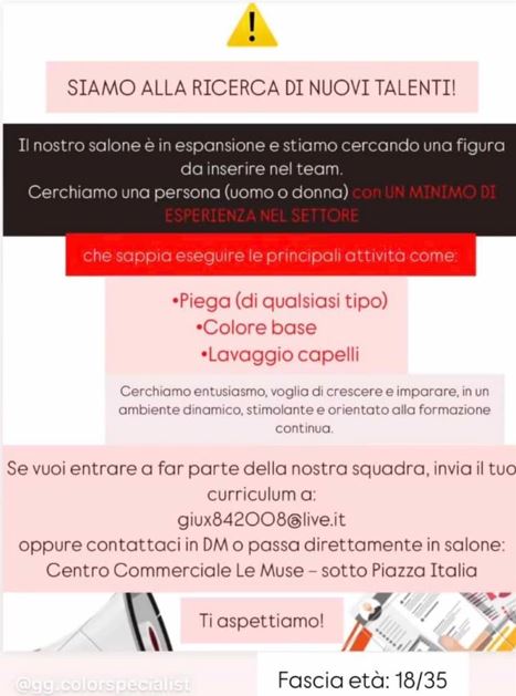 Il salone GG Color Specialist, situato a Paola presso il Centro Commerciale Le Muse, sotto Piazza Italia, è alla ricerca di un/una parrucchiere/a con un minimo di esperienza, da inserire nel nostro team affiatato e in continua crescita.