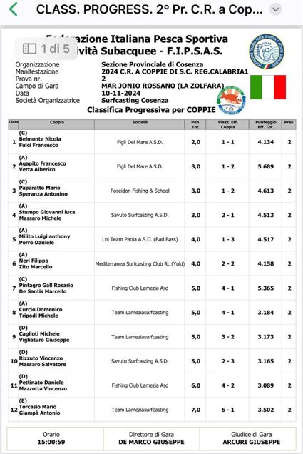 Complimenti a tutti per i risultati raggiunti e un applauso al giudice di gara Giuseppe Arcuri e alla Società organizzatrice Surfcasting Cosenza per aver diretto e fatto svolgere al meglio l’evento.