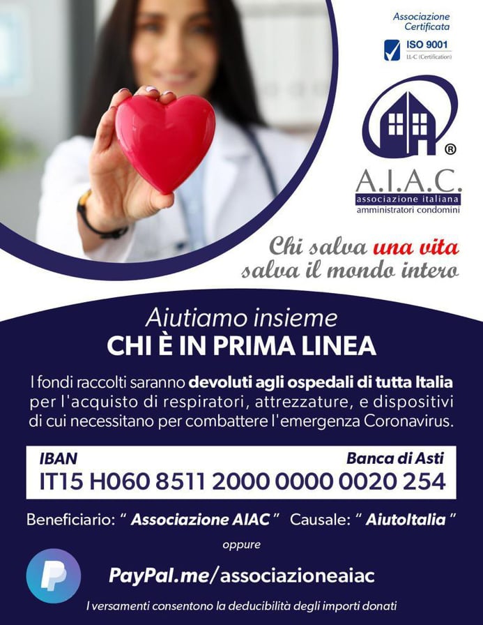 Anche gli amministratori di condominio scendono in campo attraverso la loro associazione. AIAC ha infatti aperto una raccolta fondi i cui proventi saranno devoluti agli ospedali di tutta Italia per l’acquisto di respiratori, attrezzature e dispositivi necessari per combattere l’emergenza coronavirus.