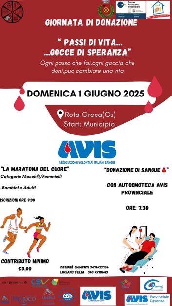 Domenica 1 Giugno 2025 la Pro Loco, in collaborazione con l’Avis di Lattarico una giornata di sensibilizzazione dal titolo “Passi di Vita…Gocce di speranza”