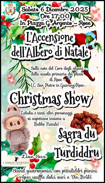 Alle ore 17:00 seguirà la cerimonia di accensione dell’Albero di Natale in piazza Gaetano argento accompagnata dal Coro delle Scuole Primarie dell’ istituto comprensivo San Pietro in Guarano/Rose